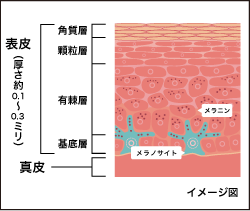 皮膚は「表皮」「真皮」「皮下組織」の3層によって構成され、表皮の95%が表皮細胞、残りの5%にメラノサイトという色素細胞が含まれています。 メラノサイトは表皮の1番下の層である基底層と毛の根元の膨らみがある部分の毛球に存在します。基底層のメラノサイトは、表皮細胞にメラニン顆粒を供給することで紫外線から皮膚を防御する役割を担っています。