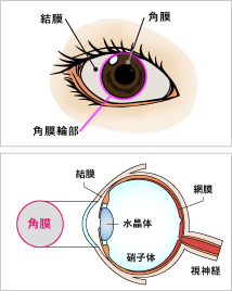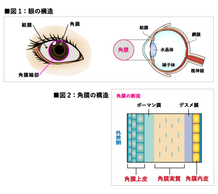 Q 眼と角膜の構造を教えてもらえませんか?A 眼の構造を図1の左の図に示しています。 正面から見ると黒目(角膜)、茶目(虹彩)、白目(結膜)に分かれます。 図1の右の図が眼球の断面図ですが、角膜は眼球の一番表面にある透明の膜で、その奥に水晶体、網膜があります。 眼の構造は、よくカメラにたとえられますが、角膜と水晶体がレンズの役割、網膜がフィルムの役割を果たします。