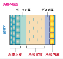 ●角膜は主に3つの細胞層によって構成されています。「角膜上皮」「角膜実質」「角膜内皮」です。 この3層の中でもいち早く研究され治療に採用されているのがイタリアのペレグリーニ教授らにより発表された「自家培養角膜上皮」です。 さらにもうひとつの培養方法として患者さんご自身の口腔粘膜組織から取り出した口腔粘膜上皮細胞を培養してシート状にした「自家培養口腔粘膜上皮」があります。