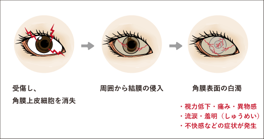Q 角膜上皮幹細胞疲弊症(Limbal Stem Cell Deficiency:LSCD)はどんな病気で、どんな症状がありますか?A LSCD は、角膜上皮の幹細胞が無くなることで透明な角膜上皮を作ることができなくなり、 血管を伴った混濁した結膜が侵入することで角膜が濁る病気です。 症状として視力低下、まぶしさ、乾燥感、不快感などがあります。