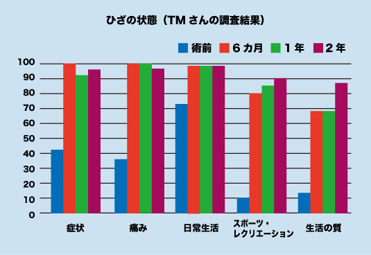 注)このグラフはTMさんに「症状」「痛み」「日常生活」「スポーツやレクリエーション活動」「生活の質」について、回復の程度を5段階に分けて聞き取りをした結果です。例えば、「症状」の場合、質問が5つあり「ひざに腫れがありますか?」という質問に対し「まったくない」「まれにある」「ときどきある」「ひんぱんにある」「いつもある」のどれかを答えていただきます。「まったくない」という一番良い状態の回答が多ければ多いほど、スコアは100に近づきます。つまり、グラフは、術前は低かったスコアが経時的に100に近づき改善されていることを示しています。「症状」「痛み」「日常生活」と比べて「スポーツやレクリエーション活動」「生活の質」の術前スコアが低いこともわかります。しかし、1年、2年と経過をみますと90点から100点近くまで改善されています。