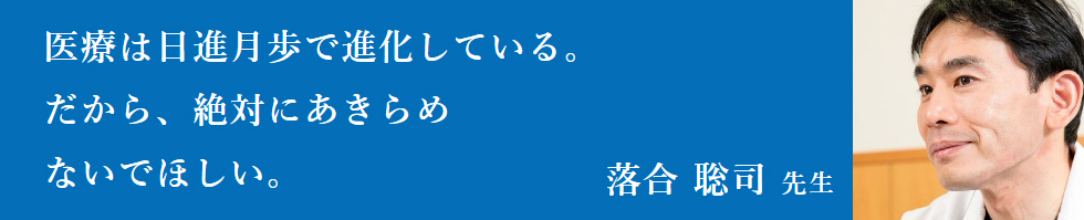 落合:以前は治せなかった方、もういいやと諦めてしまっている方にぜひお伝えしたいことは「医療は日進月歩で進化しています」ということです。自家培養軟骨移植術をはじめとした再生医療を用いた新しい治療法がでてきて、治る可能性がどんどん広がっています。
