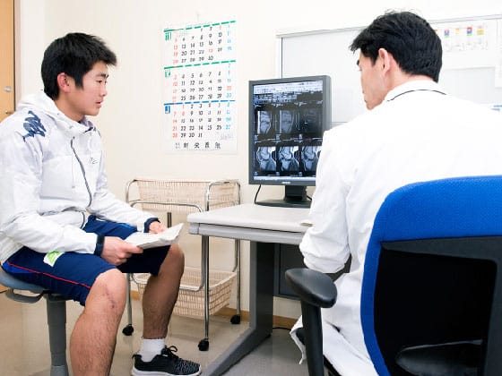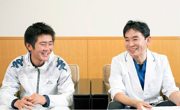 患者さんの6割がアスリート、4割が一般の方という割合で、中高齢者や骨折の方も多く来院されます。スポーツの種類では、チームドクターとして山梨学院大学やTOSENクリーンファイターズ(社会人チーム)のラグビー部を診ていることもあり、ラグビー関係が少し多いです。あとは、バレーボール、サッカーという感じです。植松くんもそうですが、山梨はサッカーも盛んですからね。 -