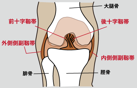 靱帯損傷の症状は、急性期(約3週間)は、ひざに痛みや可動域制限や腫れ(関節内血腫)がでてきます。 急性期を過ぎると痛み、腫れ、可動域制限は回復してきます。 しかし、損傷部位や外力の大きさによってはひざの不安定感が徐々に目立ってくることがあります。 これは下り坂やひねり動作、急に立ち止まったりする際にはっきりわかることが多いです。 一般に外反強制により内側側副靱帯が損傷し、内反強制により外側側副靱帯が損傷します。 また、着地姿勢で足が外に向いてひざが内に入るなどの外力で前十字靱帯が損傷し、 高所からの転落や交通事故によるクルマのダッシュボード接触で脛骨前面の後方への外力がかかり後十字靱帯が損傷します。 最も頻度が高いのは内側側副靱帯損傷であり、外側側副靱帯が単独で損傷することは非常に稀です。 非常に強い外力を受けた場合は複数の靱帯に損傷が及ぶこともあります。