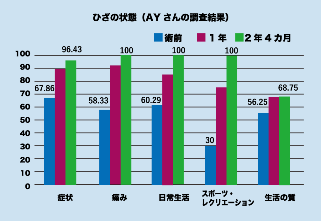 AY:もう2年半経ちますね。現在はひざの痛みもなく日常生活で不自由を感じることはなくなりました。仕事も問題なくできています。