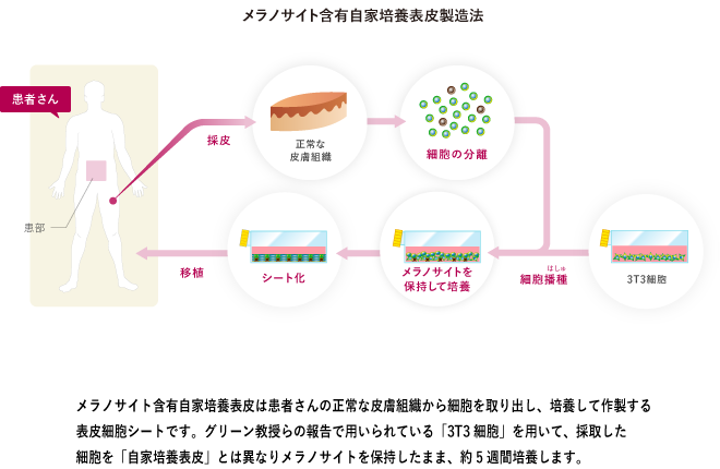 「メラノサイト含有自家培養表皮」は、患者さん自身の皮膚組織から分離した細胞を培養して製造するメラノサイトを保持した自家培養表皮です。