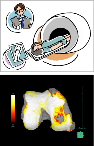 診断までに、レントゲン検査(X線検査)、MRI検査、CT検査などの画像検査などもおこなわれます。 ひざ軟骨損傷は特に診断が難しく、患者さんの自覚症状もさまざまです。損傷が数カ所ある場合もあります。 そのため、外から分かりにくい場合は関節鏡を入れて検査をすることもあります。 最近では画像データを三次元で解析し、色分けされた画像で、厚さや欠損面積の大きさを計測できる機器もあります。