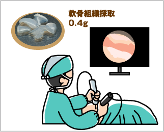 「自家培養軟骨移植術」は、手術を2回おこないます。 その1回目が培養する軟骨細胞を採取する手術です。 関節鏡による手術で、手術時間は30~40分程度、 入院期間は1日程度です。採取する軟骨組織は0.4gほどです。