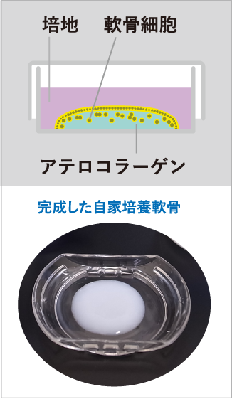 アテロコラーゲンに包埋された軟骨細胞は、4週間培養されます。 この培養期間中に軟骨細胞は増え、軟骨基質(軟骨組織の主要な成分)を作り出して本来の軟骨の性質に近づいていきます。 完成した「自家培養軟骨」は500円玉大でゼリーのような硬さのものになります。