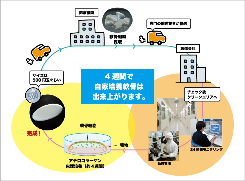 製造会社からの出荷時には、「自家培養軟骨」に菌が混入していないかなどをチェックする綿密な出荷検査・確認検査がおこなわれ、 専門の輸送業者によって慎重・確実に指定された日時に医療機関に届けられます。