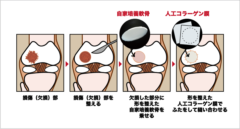 手術は全身麻酔でおこなわれます。ひざの切開はおよそ10〜15cmです。 軟骨欠損部は損傷で周辺が荒れているのできれいに整えます。 また、剝がれた軟骨の破片などが残っている場合は全て取り除きます。欠損部が数カ所ある場合も同様の処置をおこないます。 次に欠損部に合わせ、「自家培養軟骨」の形を整え、欠損部に乗せていきます。 「自家培養軟骨」が欠損部からずり落ちないように、人工コラーゲン膜(以前は患者さんの骨膜)でふたをしてしっかりと縫い合わせます。 最後に皮膚を縫い合わせて終了です。