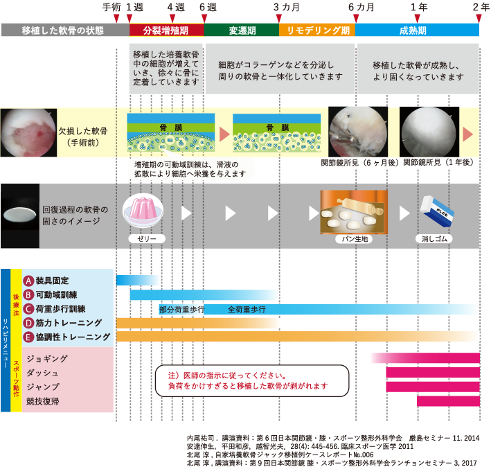 ●スポーツ復帰:一般的には、サイクリングのような衝撃が少ないスポーツは6ヵ月から、ジョギングは8~9カ月から、ダッシュ・ジャンプは9カ月以降、競技復帰は1年以降から許可されますが、患者さんの移植された軟骨やひざの状態により医師が最適な復帰の判断をします。
