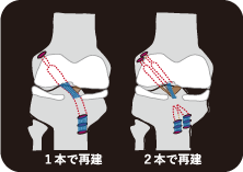 断裂した前十字靱帯は、他の靱帯と異なり自然に治癒しにくいため、新たに靱帯をつくらなければなりません。日本では多くの場合、患者さん自身の腱(自家腱)を使用して再建します。 主に1本で再建する場合と、2本で再建する場合があり(図参照)、最近では、身体的な負担が少なく術後の傷跡も小さい、関節鏡(内視鏡)視下でおこなわれるようになりました。