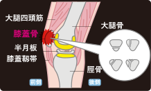 膝蓋骨の一部が離れている病気で、走っているときやジャンプするときにひざ前面に痛みを感じます。クラブ活動などでスポーツを続けている10歳代の男女に多くみられますが、成人にみられることもあります。